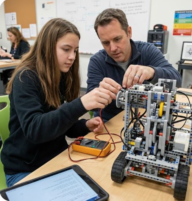 Description: Students begin to see the bridges between subjects. With guidance, they start applying their foundational skills to solve multi-faceted problems (e.g., using Math to calculate the structural integrity of an Art project).